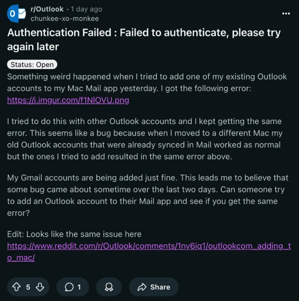 One Reddit user discovered the issue when trying to add an existing Outlook account to their Mac Mail app, receiving an error stating “Failed to authenticate, please try again later.” What makes this a bit odd is that their Gmail accounts were added without any hiccups, and Outlook accounts that were already synced on a different Mac continued working fine. It’s only the new account additions that hit a wall.