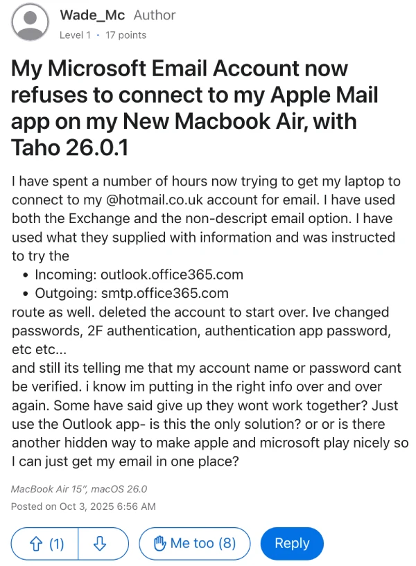 The issue extends to those who upgraded to macOS Tahoe as well. An Apple Discussions post from someone running Tahoe 26.0 explained that while their Outlook accounts work perfectly through webmail and the Outlook app, Apple Mail refuses to verify them. They tried the Microsoft Exchange option, IMAP settings, and even app-specific passwords, but nothing worked. Another user with a MacBook Air on Tahoe 26.0.1 tested multiple workarounds, including changing server addresses and resetting passwords, all without success.
