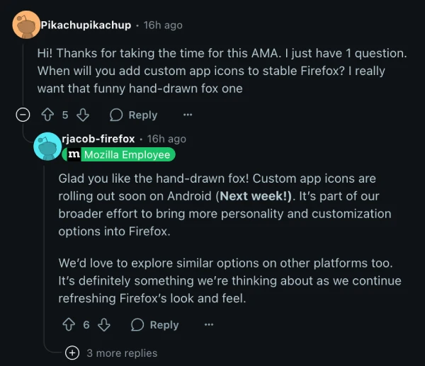 Customization is getting a boost with custom app icons rolling out to Android next week. Jacob confirmed the feature is part of Firefox’s effort to bring more personality into the browser. The hand-drawn fox icon proved particularly popular during the discussion, with users requesting it for desktop platforms. Jacob noted the team is thinking about similar options for other platforms as they continue refreshing Firefox’s look.