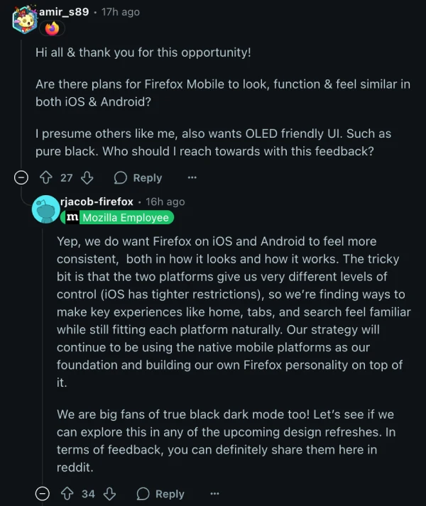 Interface improvements got plenty of attention during the AMA. Raja Jacob, Head of UX, confirmed that Firefox aims to bring consistency between iOS and Android versions, though iOS restrictions make this challenging. More exciting for many users: true black dark mode is being considered for upcoming design updates. Jacob encouraged users to share feedback about OLED-friendly interfaces directly on Reddit.