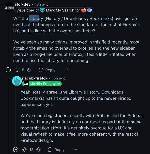 The Library interface, covering history, downloads, and bookmarks, hasn’t kept pace with Firefox’s recent design updates. Jacob admitted it feels dated compared to newer features like the revamped sidebar and profile system. The team recognizes it needs a visual and UX refresh to match the rest of Firefox.
