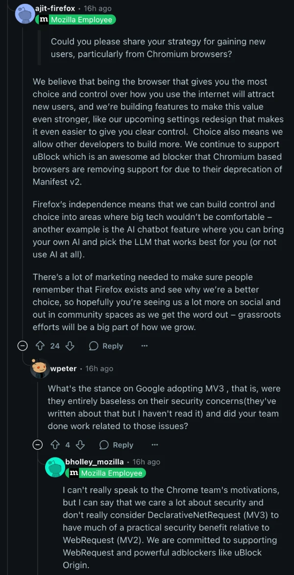 Questions about Firefox’s relationship with Google came up, particularly around Manifest V3. Holley made it clear that Firefox sees no practical security benefit in Chrome’s DeclarativeNetRequest approach compared to WebRequest. The company remains committed to supporting powerful ad blockers like uBlock Origin, which Chrome is phasing out.