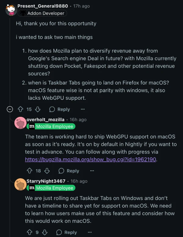 Engineering VP Andrew Overholt shared that WebGPU support for macOS is available in Nightly builds and will ship when ready. Taskbar tabs just rolled out on Windows, but the team needs to study usage patterns before committing to macOS support. The platform differences require careful consideration of how features translate across operating systems.
