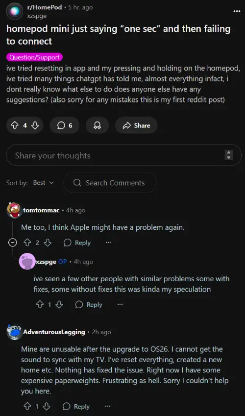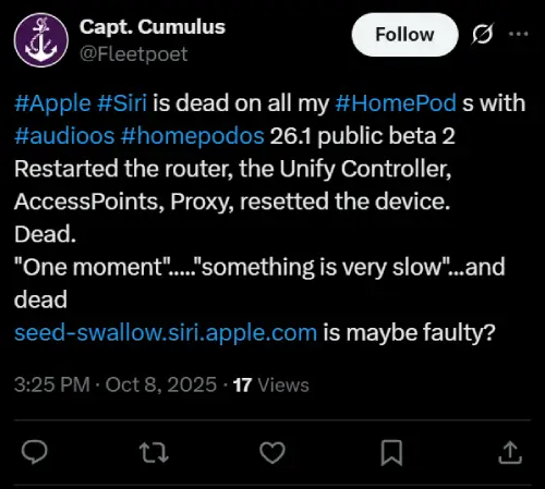 HomePod owners are taking to Reddit and X with complaints about Siri becoming completely unusable, and responding only with polite-but-useless phrases like “one moment,” “one sec,” “on it,” or “this is going a little too slow” before failing to complete any requests.