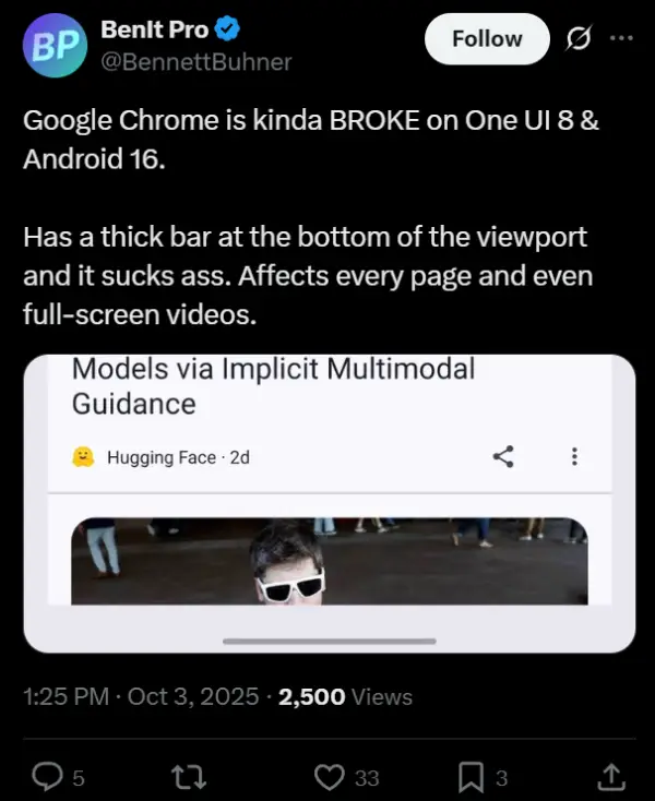 Tech enthusiast BenIt Pro shared on X that Chrome is “kinda BROKE on One UI 8 & Android 16,” calling out the thick bar that affects every page.
