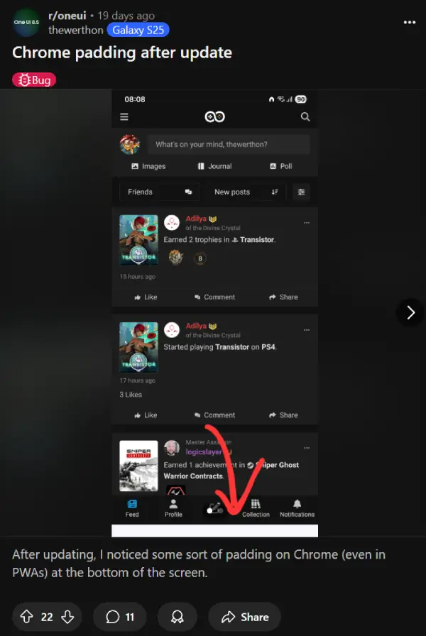Multiple Reddit threads have users reporting the same problem, with one Galaxy S25 Ultra owner noting the gap appears on all websites when using gesture navigation. Another user in the r/oneui subreddit pointed out the padding shows up in Progressive Web Apps too, suggesting it’s deeply baked into Chrome’s recent behavior changes.