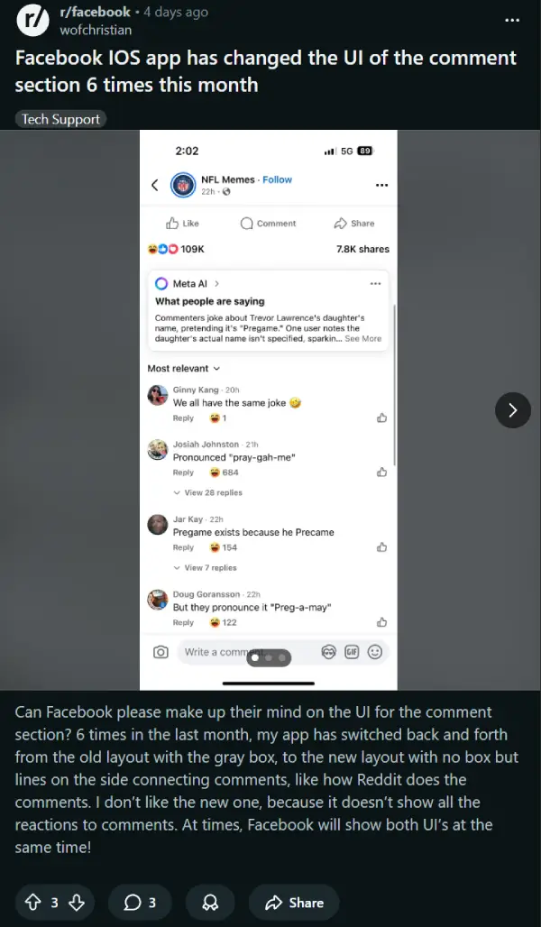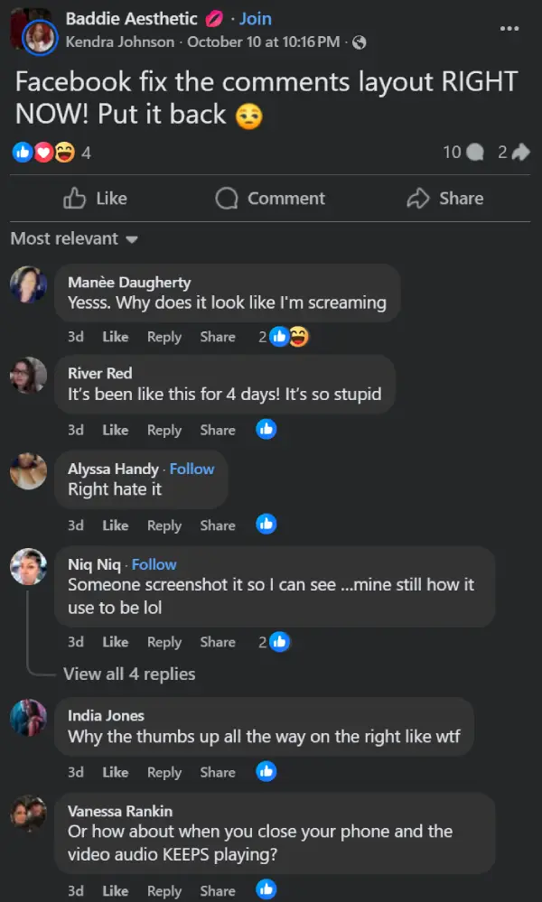 The frustration’s all over Facebook too. In the Baddie Aesthetic group, Kendra Johnson posted, “Facebook fix the comments layout RIGHT NOW! Put it back,” and the replies poured in. People hate how it makes everything look like shouting, or why the thumbs-up is shoved to the right. One even mentioned videos keep playing audio after you close the app.