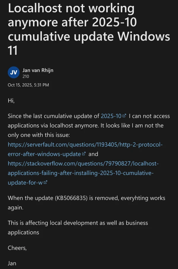 Update 17/10/25 – 12:49 pm (IST): Microsoft has now officially confirmed the connection issues following the installation of updates released on or after October 14, 2025 (KB5066835), confirming the issue affects server-side applications that rely on HTTP.sys, which often causes IIS websites (including those on http://localhost/) to fail with a “Connection reset – error (ERR_CONNECTION_RESET)” message. The affected platforms include Windows 11 (versions 24H2 and 25H2) and Windows Server 2025.