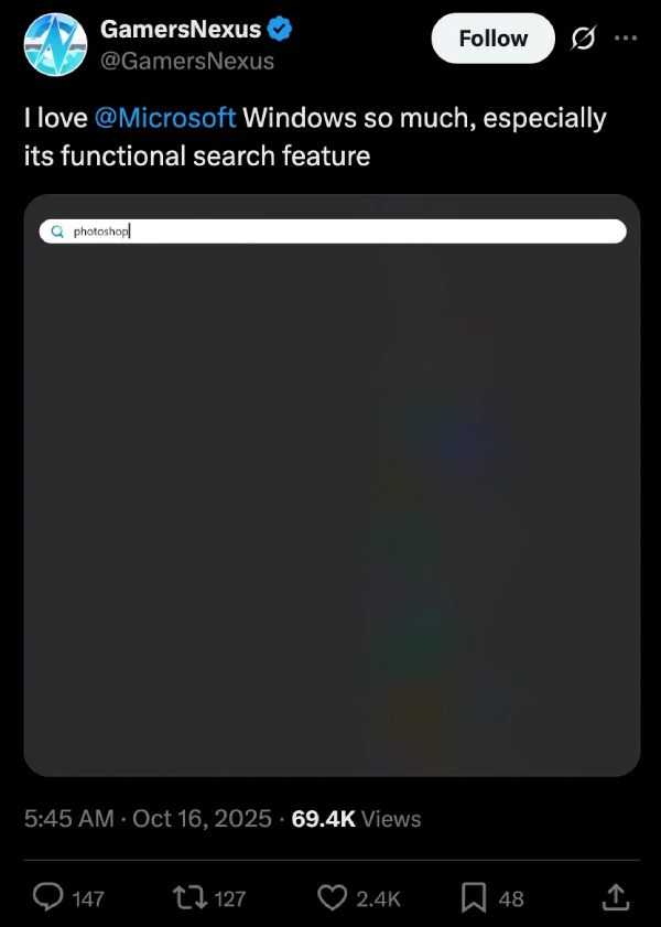 The search bar issue seems particularly widespread. Users on X have been posting screenshots of completely blank search panels, with tech channel GamersNexus sarcastically praising Microsoft’s “functional search feature.”