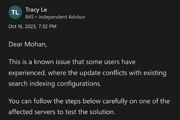 The situation got serious enough that IT administrators started noticing. On Microsoft’s own support forums, an admin reported deploying KB5066835 to over 300 servers, only to have search functionality completely stop working across all of them. Uninstalling the patch brought everything back to normal, but that’s hardly a sustainable solution.