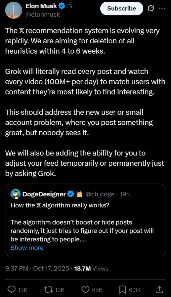 Out go the old hardcoded rules that have been dictating what shows up in your feed, and in comes Grok, xAI’s AI powerhouse, to take over the reins. According to Musk, Grok will pore over every post and more than 100 million videos daily, learning on the fly what grabs users’ attention and matching content accordingly.