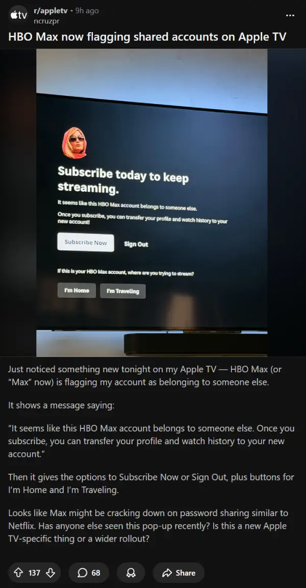 HBO Max isn’t breaking new ground here. Netflix started this whole thing back in 2023 and added something like 6 million subscribers in the quarter after they started enforcing it. Disney rolled out similar rules last year, around the same time, across all their platforms. Now every streaming service is jumping on board. Back in 2021, a Citi equity analyst reportedly estimated that password sharing costs the streaming business up to $25 billion a year, so the motivation is pretty clear.
