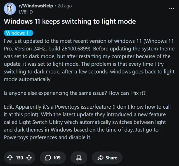 Users across multiple WindowsHelp subreddit threads have been reporting this exact problem since the latest update rolled out. One user running Windows 11 Pro (build 26100.6899) described how their system kept reverting to light mode within seconds of switching back to dark.