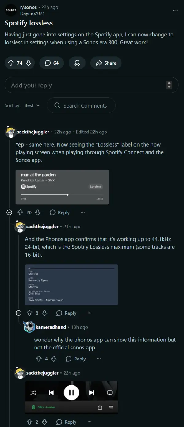 Several Sonos owners on Reddit have confirmed they can now stream lossless audio through their speakers, with the option appearing in Spotify’s settings when connected via Spotify Connect. The rollout seems to be happening without any firmware update or official announcement, catching many users by surprise. One user with a Sonos Era 300 shared that they simply opened the Spotify app settings and found the lossless option available.