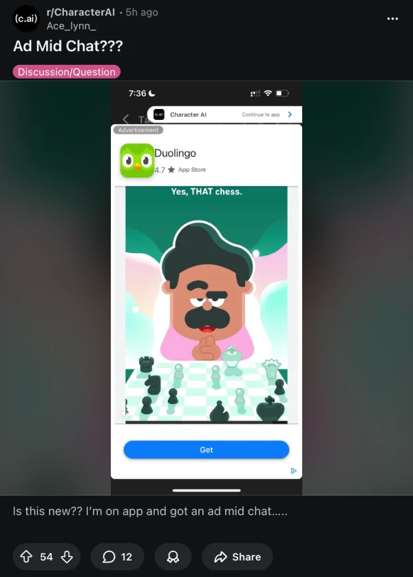 But it seems all good things do come to an end. In the past few hours, reports about ads showing up mid-chat on Character AI have ballooned up over on Reddit. One user got hit with a Duolingo commercial mid-sentence. “Is this new?? I’m on app and got an ad mid chat,” they wrote.
