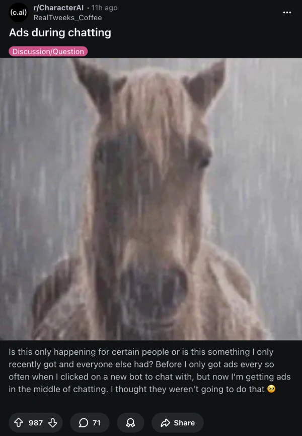 Another user posted, “Before I only got ads every so often when I clicked on a new bot to chat with, but now I’m getting ads in the middle of chatting. I thought they weren’t going to do that.” Their thread now has close to a thousand upvotes and over 70 comments from other frustrated users who’ve also started noticing ads in the middle of chats.