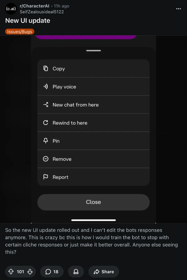 Much like any other UI change or refresh, this has also attracted backlash. Users are reporting that they can’t edit bot responses anymore, which kills the ability to train characters and refine conversations.