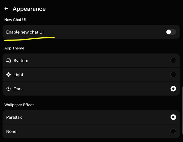 Character AI+ subscribers can switch back to the familiar interface through the app’s settings. Head to your profile settings, tap on “Appearance,” and you’ll find a toggle labeled “Enable new chat UI.” Flip that switch off, and you’re back to the version you know. The option lives right above the usual theme settings where you pick between light and dark modes.