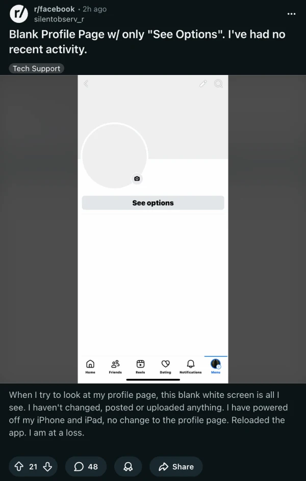 The Facebook problem seems particularly annoying. Users are finding their profile pages completely blank except for a “See Options” button floating in white space. One Reddit user described the issue: “When I try to look at my profile page, this blank white screen is all I see. I haven’t changed, posted or uploaded anything.”