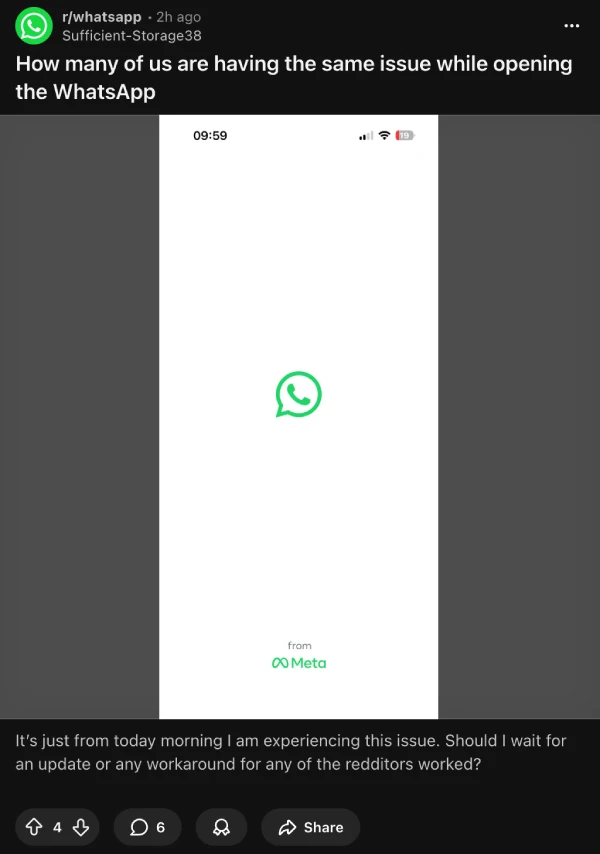 Over on the WhatsApp side, the app won’t even make it past the loading screen. People are opening the app only to watch it hang on the splash screen before eventually closing itself. One user posted a screenshot showing WhatsApp stuck in this limbo state, asking if anyone else was experiencing the same thing. The answer? Plenty of others confirmed they’re dealing with identical issues.