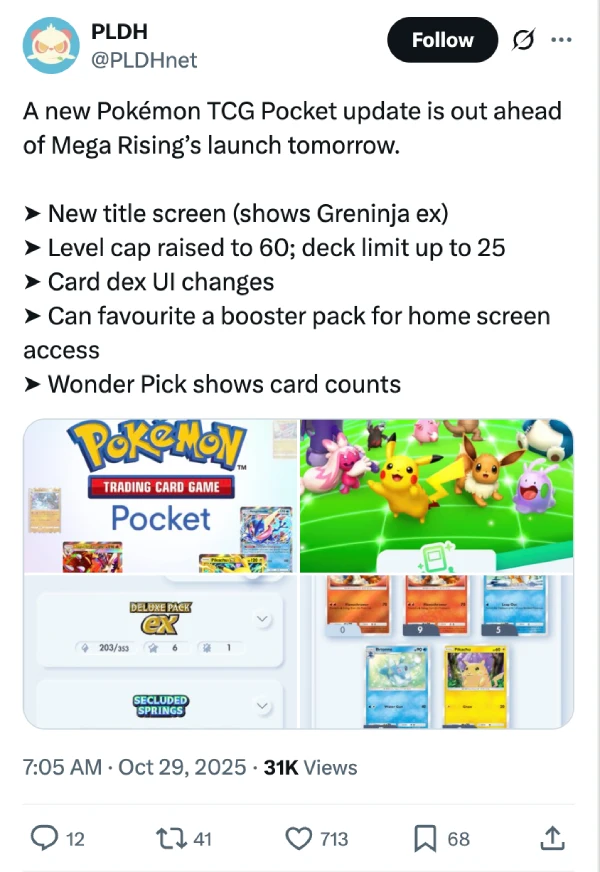 The update itself brought more than just leaks. According to a post from PLDH, the level cap jumped to 60, deck limits increased to 25, and the Wonder Pick feature now displays card counts. You can also favorite a booster pack for quicker access from the home screen, plus there are some card dex UI tweaks that make browsing your collection smoother.