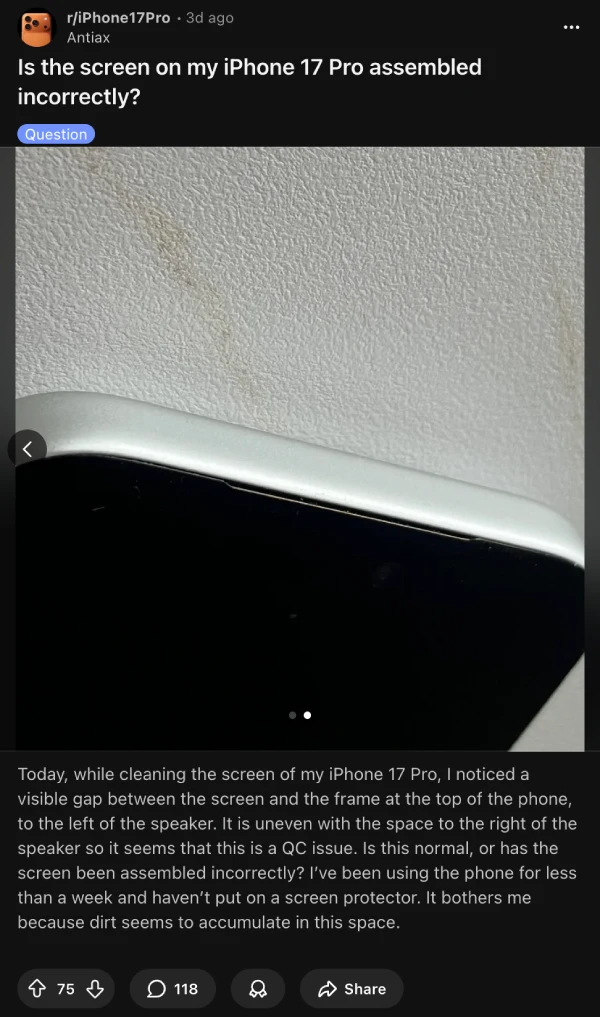 User Antiax kicked off a discussion on Reddit’s r/iPhone17Pro community three days ago after discovering what looked like a manufacturing defect on their week-old phone. The screen wasn’t sitting flush with the frame, creating a small but visible gap where dust could accumulate. The phone was in pristine condition otherwise, protected by a case and screen protector since day one with no drops or damage. What started as a single complaint quickly turned into something bigger when other users chimed in with similar experiences.