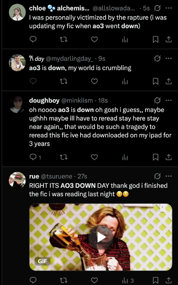 As expected, many readers are lamenting their lack of preparation — from someone who couldn’t download a fic in time to others joking about having to “touch grass” during the outage. Check out some of the other reactions in the screenshot below: