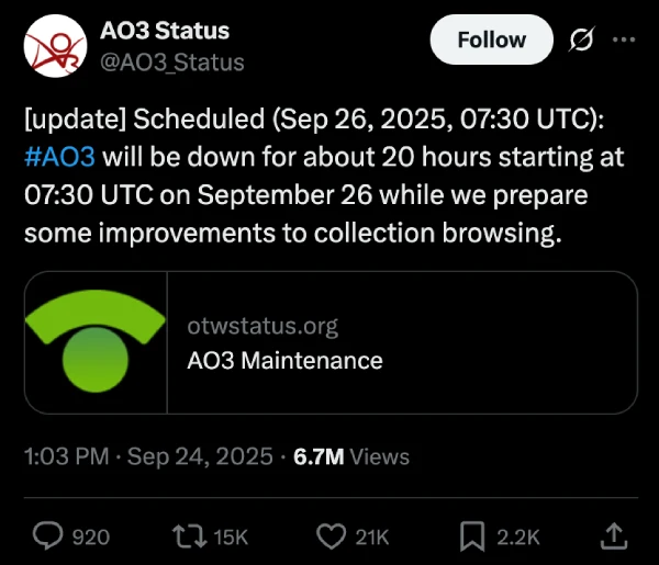 AO3 officially went dark at 7:30 am UTC today for scheduled maintenance that’s expected to last about 20 hours. The site’s administrators warned users about the upcoming maintenance with a post on X a couple of days ago.