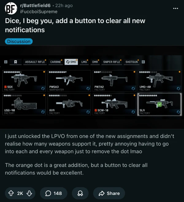 The orange notification dots in Battlefield 6 have become a source of frustration for players who just want a clean menu. What started as a helpful feature has turned into a tedious chore that requires clicking through dozens of weapon presets just to clear a single attachment unlock.