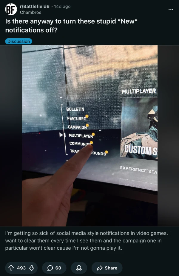 DICE added these notification dots a few weeks after launch, responding to player feedback about not knowing what they’d unlocked. But the implementation feels incomplete. It’s like they heard half the request and called it a day. Players wanted to know what they unlocked. What they got was a system that tells them something is new but makes them play detective to find it.