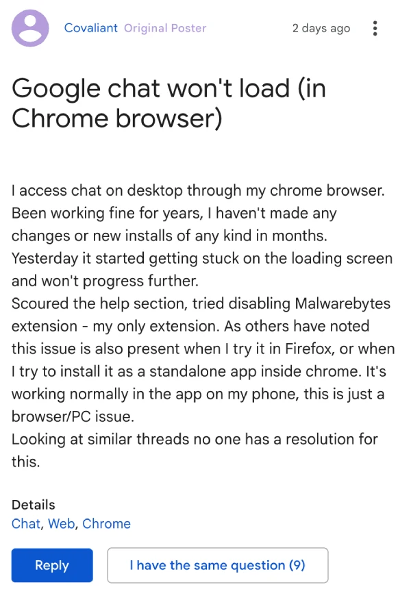 One affected user described how Chat had been working perfectly for years before suddenly getting stuck on the loading screen. After trying the usual fixes like disabling browser extensions and clearing cache, nothing seemed to help.