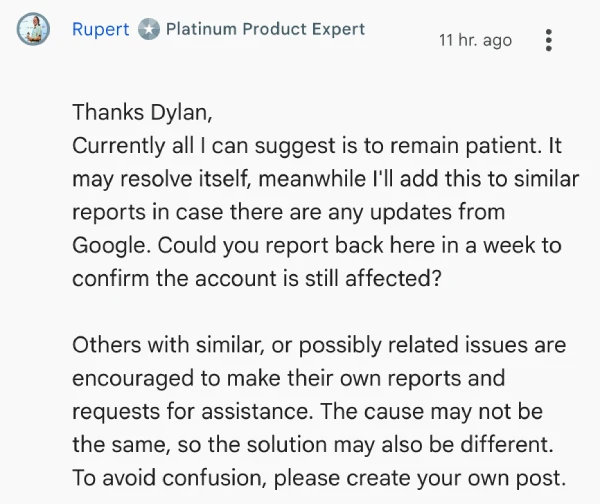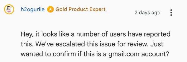 The good news is that Google Product Experts have acknowledged the situation and confirmed they’ve escalated the issue for review. They’re currently collecting information from affected users to investigate what’s causing this selective account problem. Most reports seem to involve gmail.com accounts specifically.