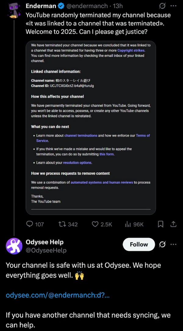 Rival platform Odysee has already reached out, offering Enderman a home for his content.