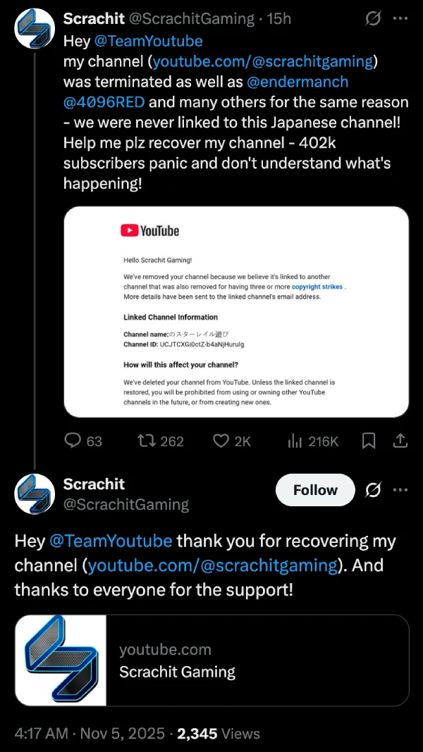 Update 05/11/25 – 09:10 am (IST): Reports from yesterday suggest that the issue extended beyond just Enderman. Multiple other channels were terminated due to a glitch in the system linking them to a random Japanese channel. However, it seems like YouTube is rectifying the major mistake and is reinstating channels that were terminated falsely.