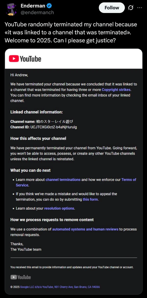 The termination email, shared by Enderman on X, stated that his secondary channel “Andrew” was permanently removed because it was “linked to a channel that was terminated for having three or more Copyright strikes.” The linked channel name appears in Japanese characters, which Enderman maintains he has zero connection to. The email went further, warning that his main channel would also face permanent termination unless the linked channel is reinstated.