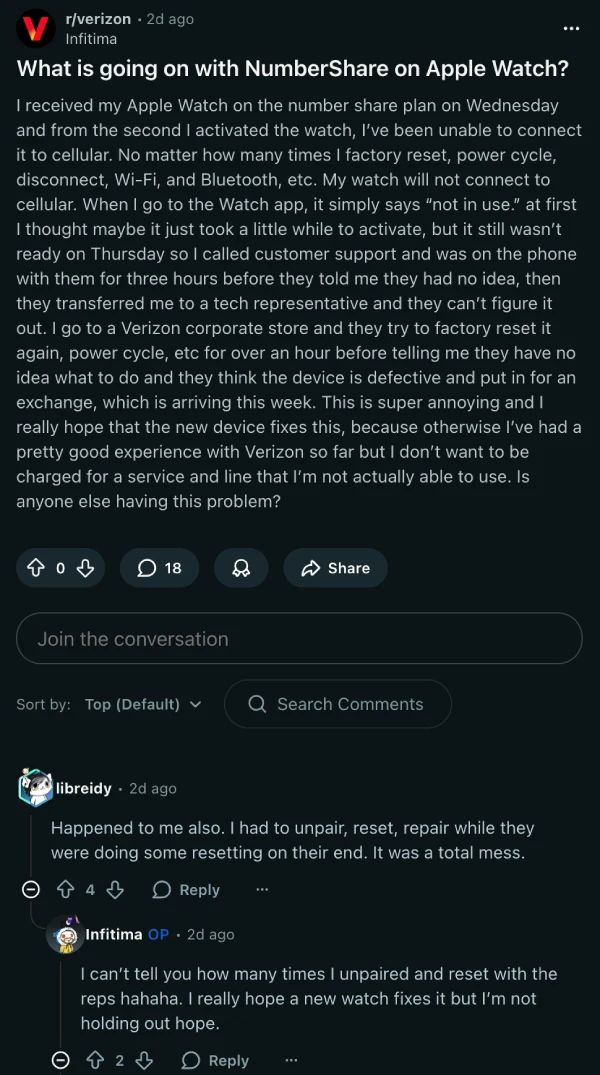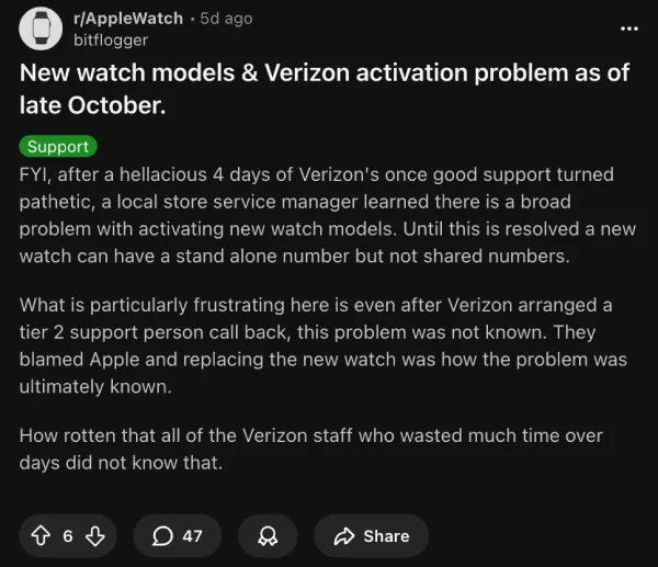 One frustrated Verizon customer described three hours on the phone with support before being told they had no idea what was wrong, while another mentioned their watch had been stuck in limbo for over a week with no resolution in sight.