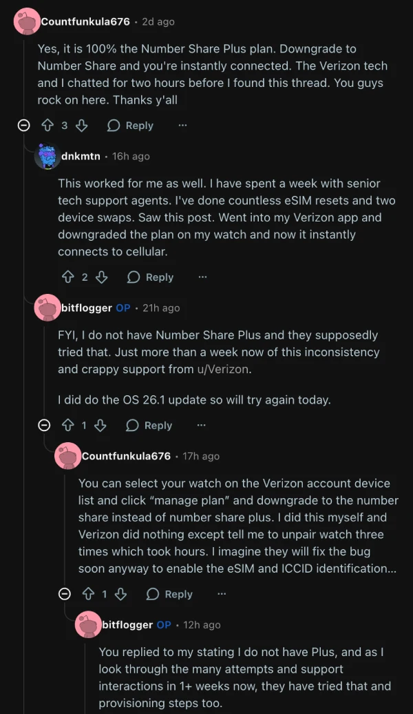 One user mentioned switching plans forced their watch to download a new eSIM, which resolved the “Not In Use” status. However, this fix doesn’t seem to work universally, and others report success by simply changing their cellular plan within the carrier’s app without removing the watch’s eSIM first.