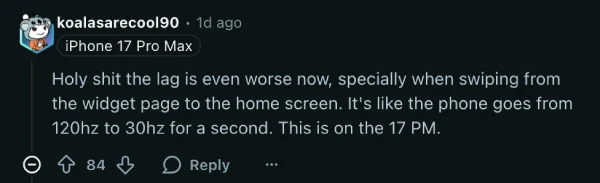 What makes this situation particularly baffling is that some users report the issue was actually resolved in iOS 26.1 beta 3, only to resurface in beta 4 and persist through to the final release. One user on Reddit described the experience as the phone dropping from 120Hz to what feels like 30Hz for a brief moment during the swipe.