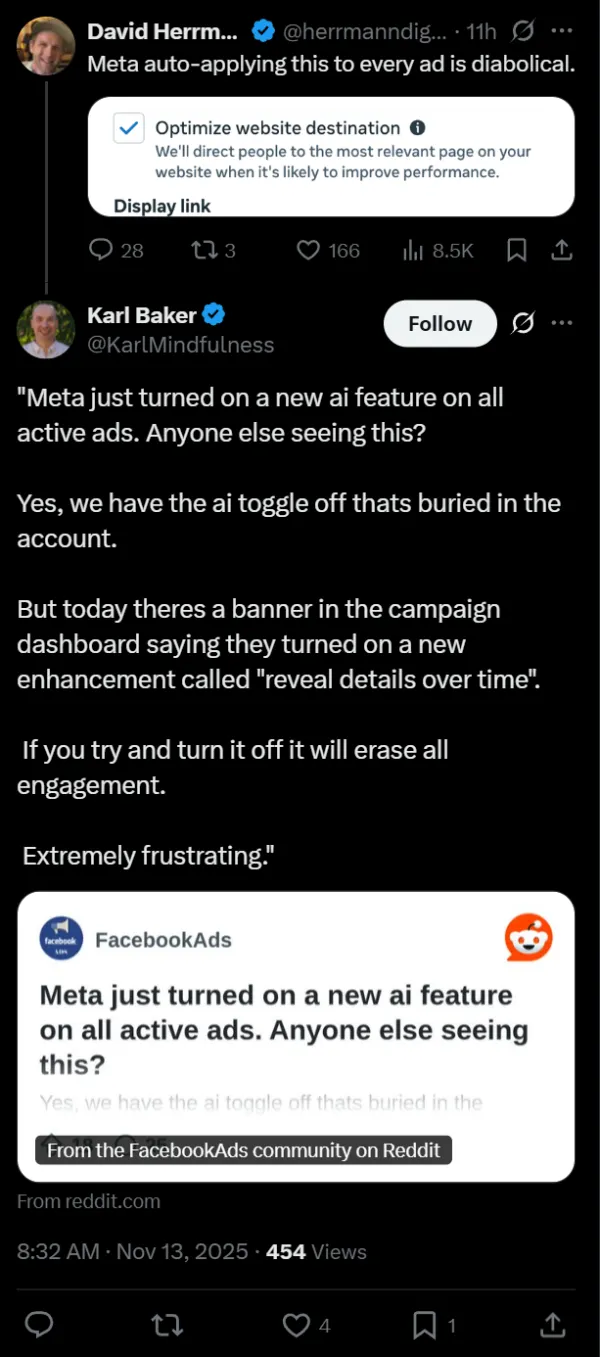 Within hours, dozens of advertisers jumped in with the same story: creative AI testing disabled at the account level, yet a new enhancement applied anyway.