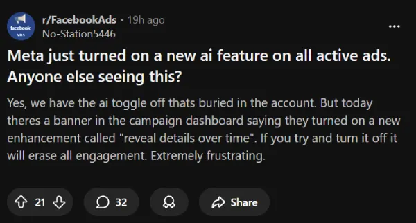 The backlash started almost immediately in r/FacebookAds, where users tried to piece together what Meta had actually changed. The original post that kicked things off asked whether anyone else had seen the new toggle suddenly appear on ads that had been running just fine.