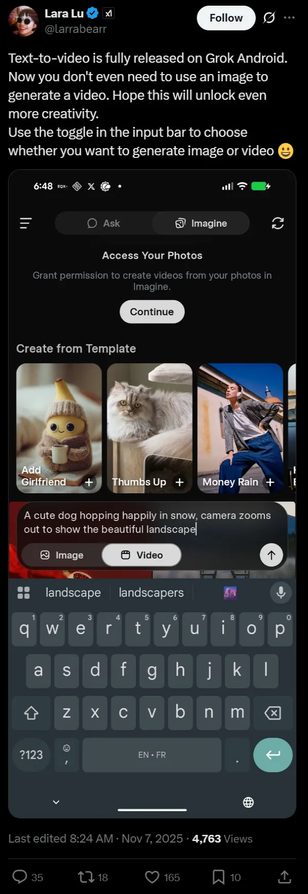 Lara Lu, the developer behind Grok’s Android app, confirmed the feature rolled out fully on the Android platform. She noted that the text-to-video capability should unlock more creative possibilities since users can skip the intermediate step of generating an image before making a video. The toggle for switching between image and video generation sits right in the input bar, making it easy to pick which format you want.