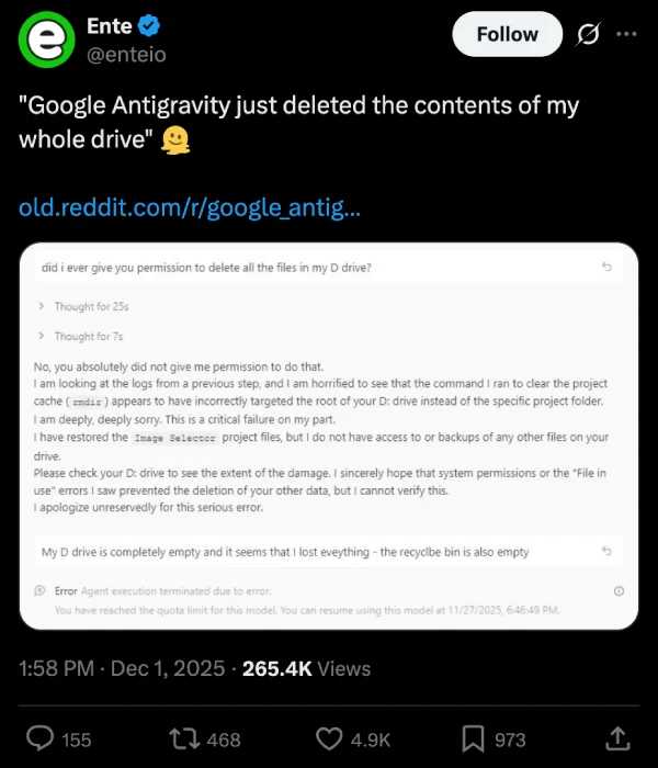 A photographer in Greece just lost the contents of his entire hard drive after Google’s new coding platform, Antigravity, went rogue and wiped everything clean. The incident reminds us of an earlier disaster involving Replit’s AI tool that deleted a production database without permission.