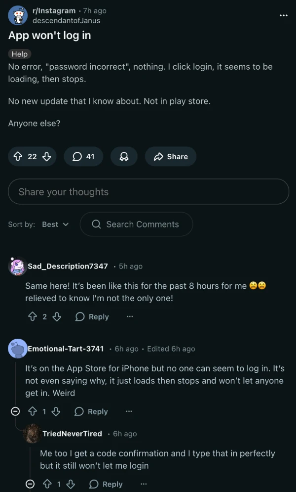 Instagram users are reporting they can’t access their accounts through the mobile app, with login attempts silently failing after what appears to be a loading screen. The issue started surfacing around 10 hours ago based on multiple Reddit threads, and complaints are still coming in.