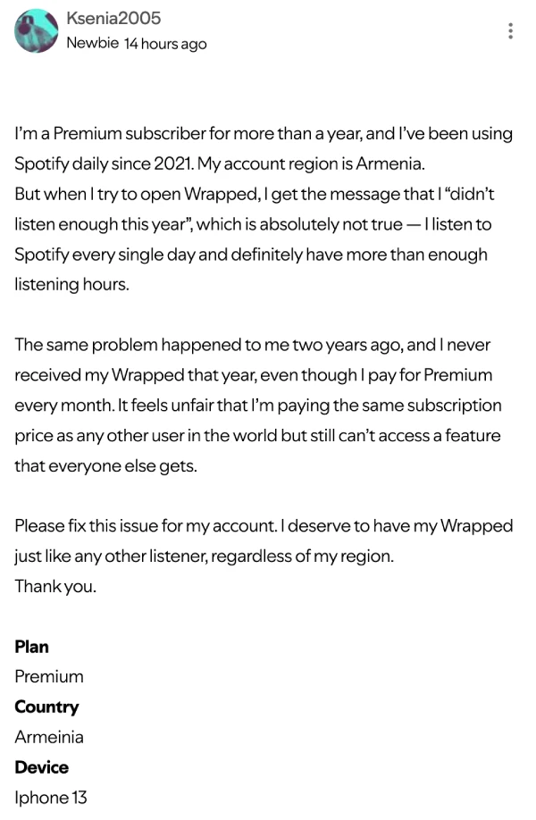 The frustration makes sense when you look at who’s being locked out. One Premium subscriber from Armenia posted that they’ve listened daily since 2021 and pay the same monthly fee as everyone else, yet still got told they “didn’t listen enough this year.”