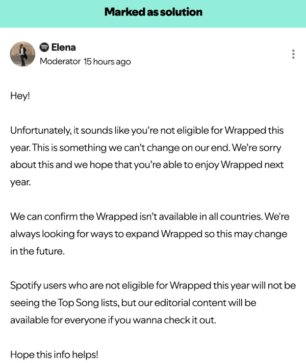 Turns out, it’s not about your listening habits at all. A Spotify moderator finally confirmed what many suspected, but the company doesn’t advertise upfront: Wrapped isn’t available in all countries. The moderator made it clear that support can’t manually enable the feature and apologized to affected users, saying the team hopes to expand availability in the future.