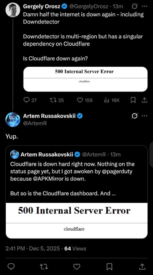 Downdetector charts shot vertical with complaint spikes for Cloudflare and everything downstream.