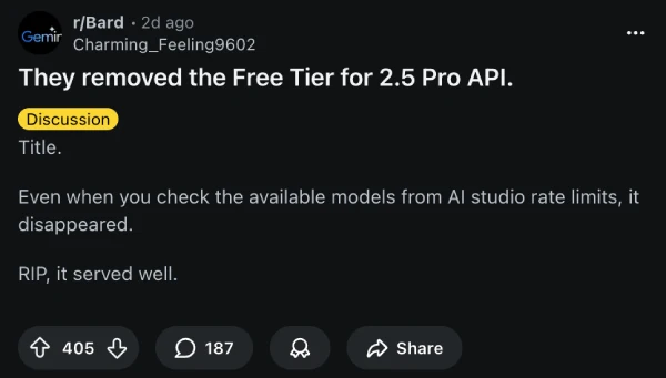 “RIP, it served well,” wrote one Reddit user in r/Bard, kicking off a thread that’s now filled with over a hundred frustrated developers.