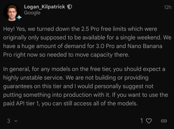 Logan Kilpatrick, Google’s Product Lead for AI Studio and Gemini API, eventually showed up in the comments to explain what happened. His take? The free tier is only intended for quickly testing new models before building with them.