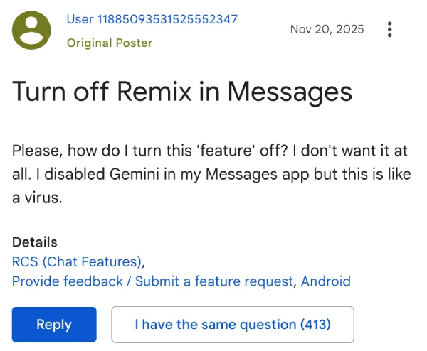 One user on Google’s official Messages support thread called it “like a virus,” while others report that it adds annoying extra steps when trying to zoom in on photos. The thread has garnered over 400 “I have the same question” responses, with users repeatedly asking how to disable what they see as a forced feature.