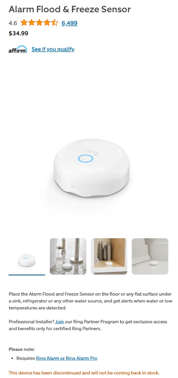 The dedicated page for the Alarm Flood & Freeze Sensor shows a similar status, despite Ring still actively marketing bundles that previously included it.